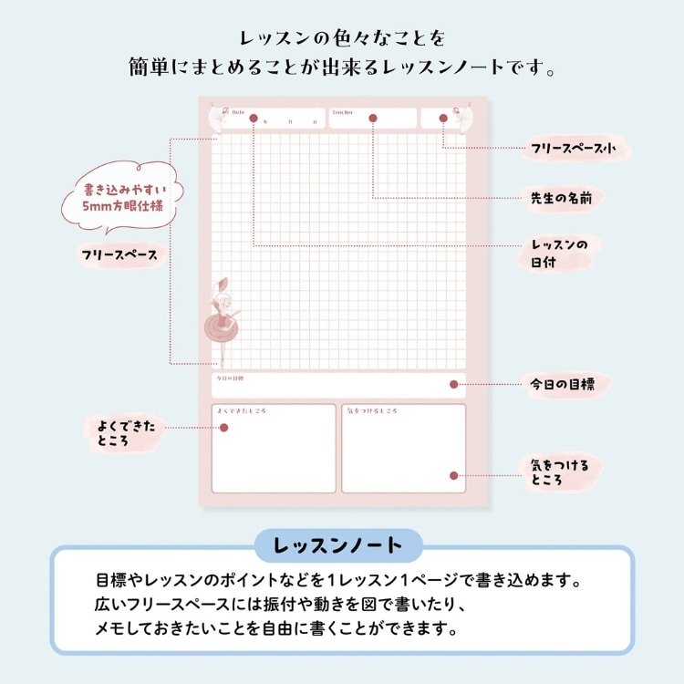 レッスン記録や日々のメモに最適なフォーマットと、華やかな表紙デザインが魅力です
