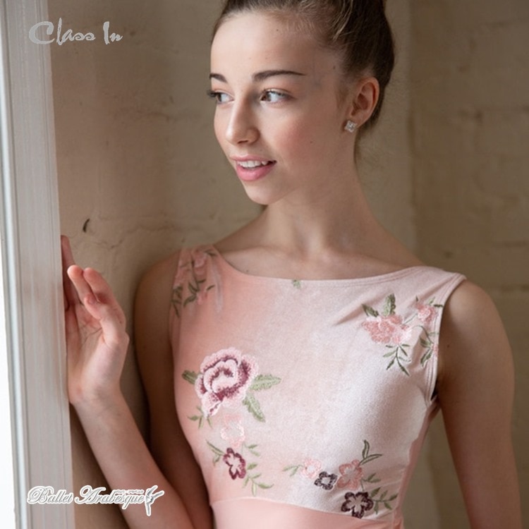 【Class In】フラワー刺繍入り サーモンピンク ボートネックタンクレオタード 大人 ベルベット EM425
