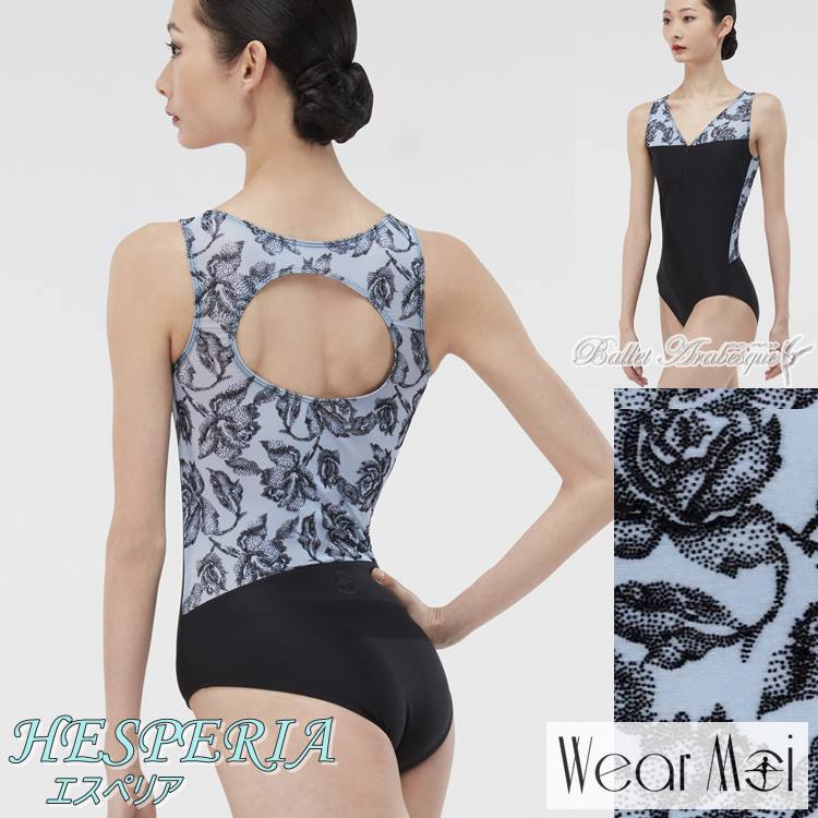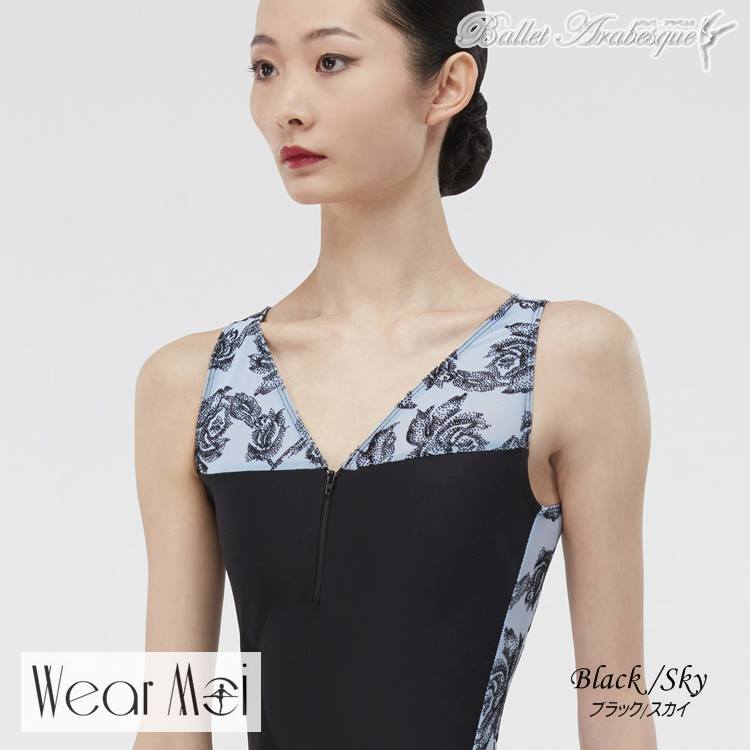 タンクスタイルキャミソールレオタード。フロントはクォータージップで開閉。オープンバックとうっとりするバラ柄がアクセントです。